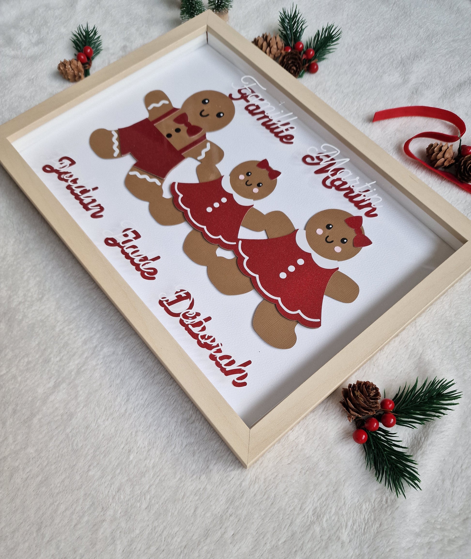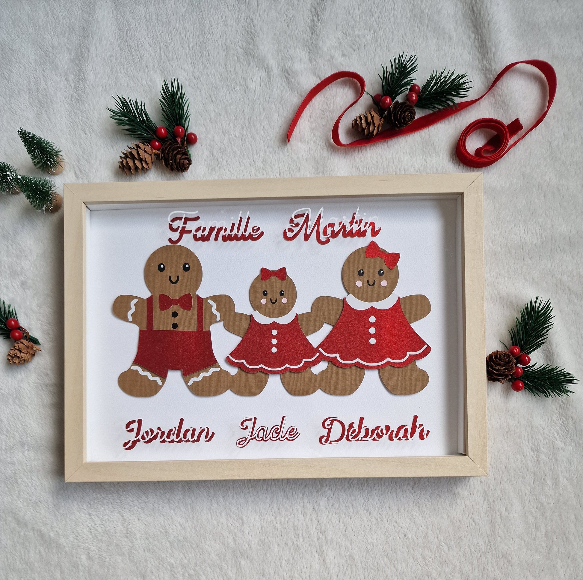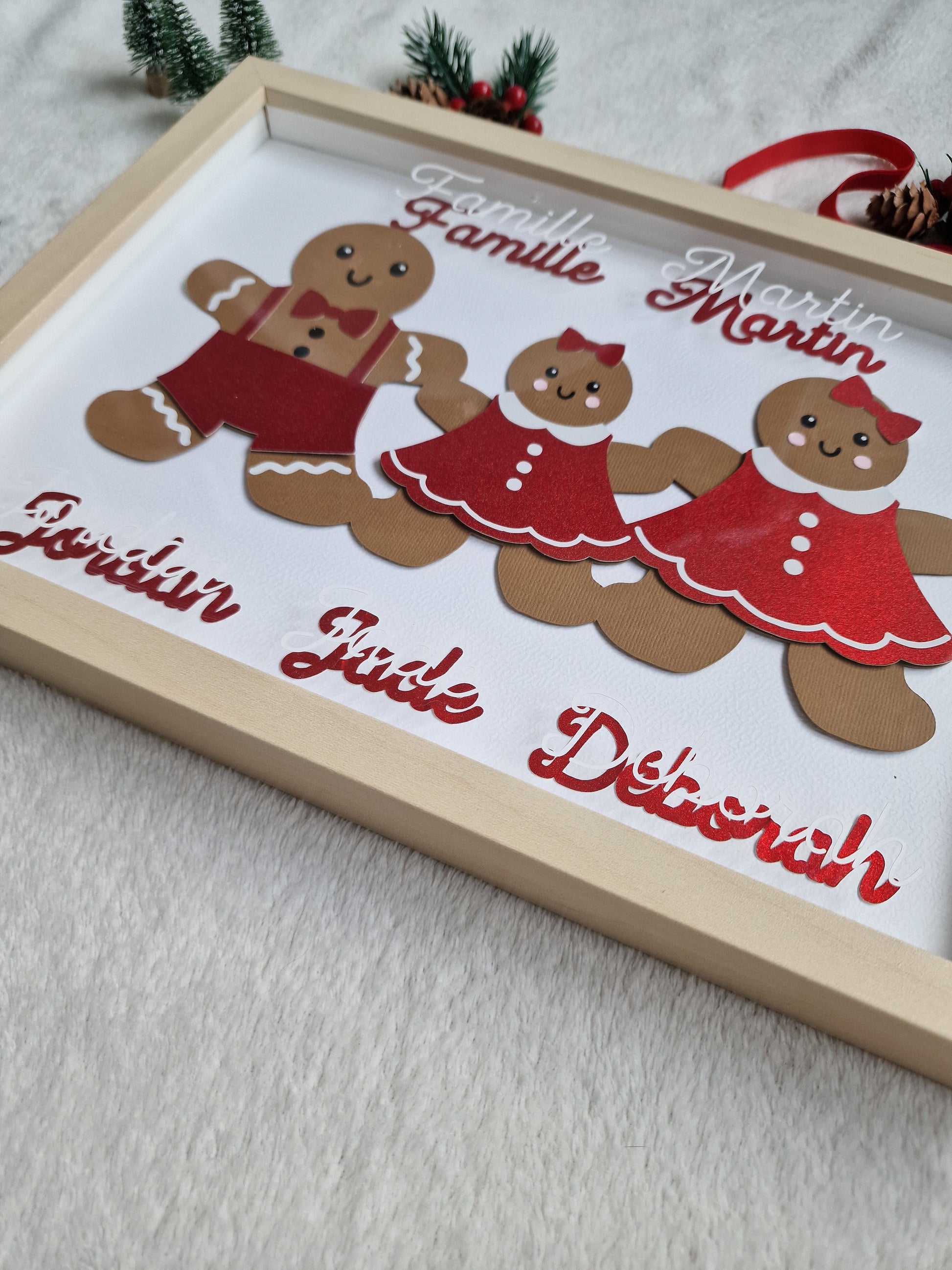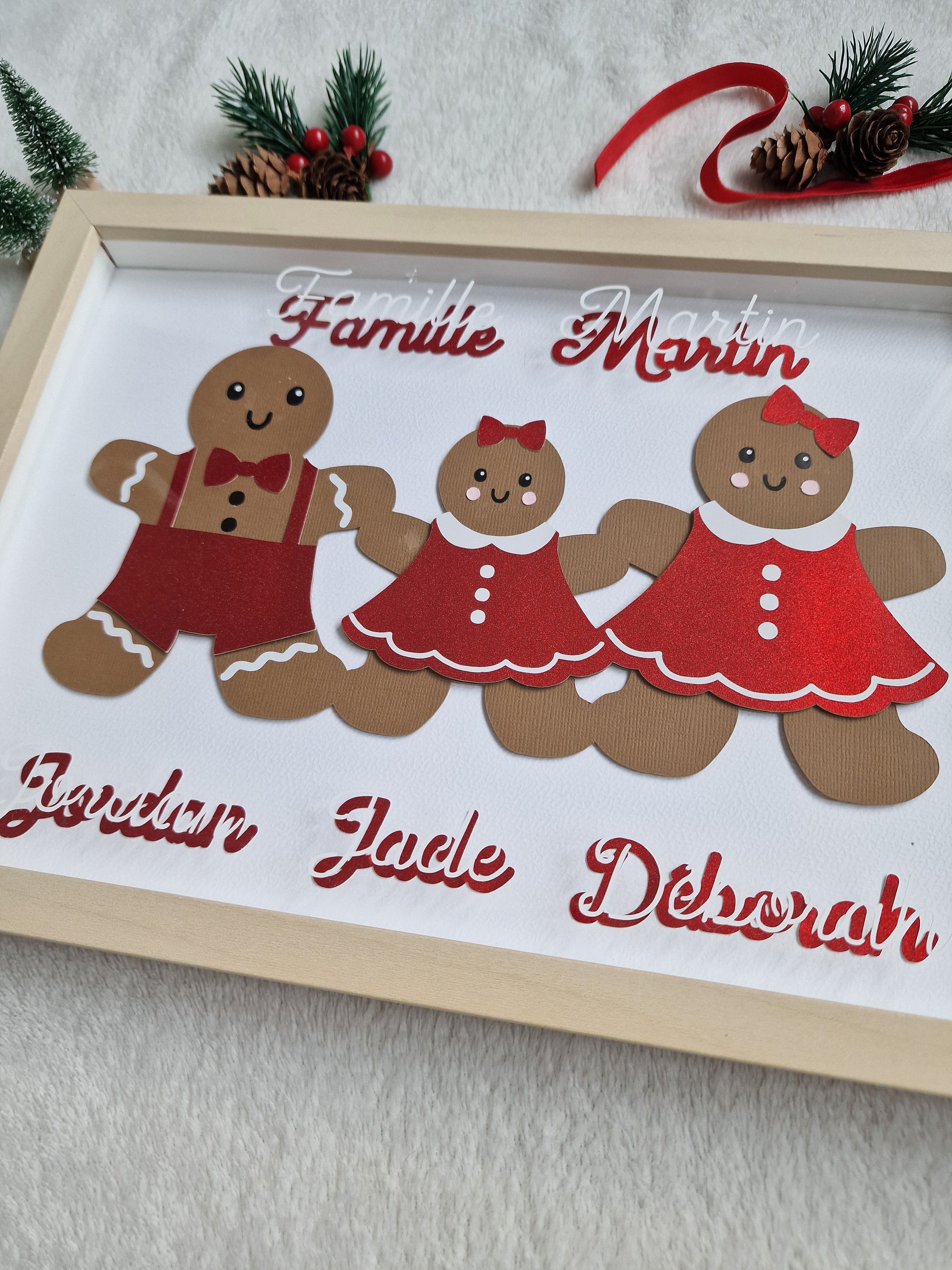 Plongez dans la magie de Noël avec ce cadre “Famille pain d’épices”, entièrement réalisé à la main.