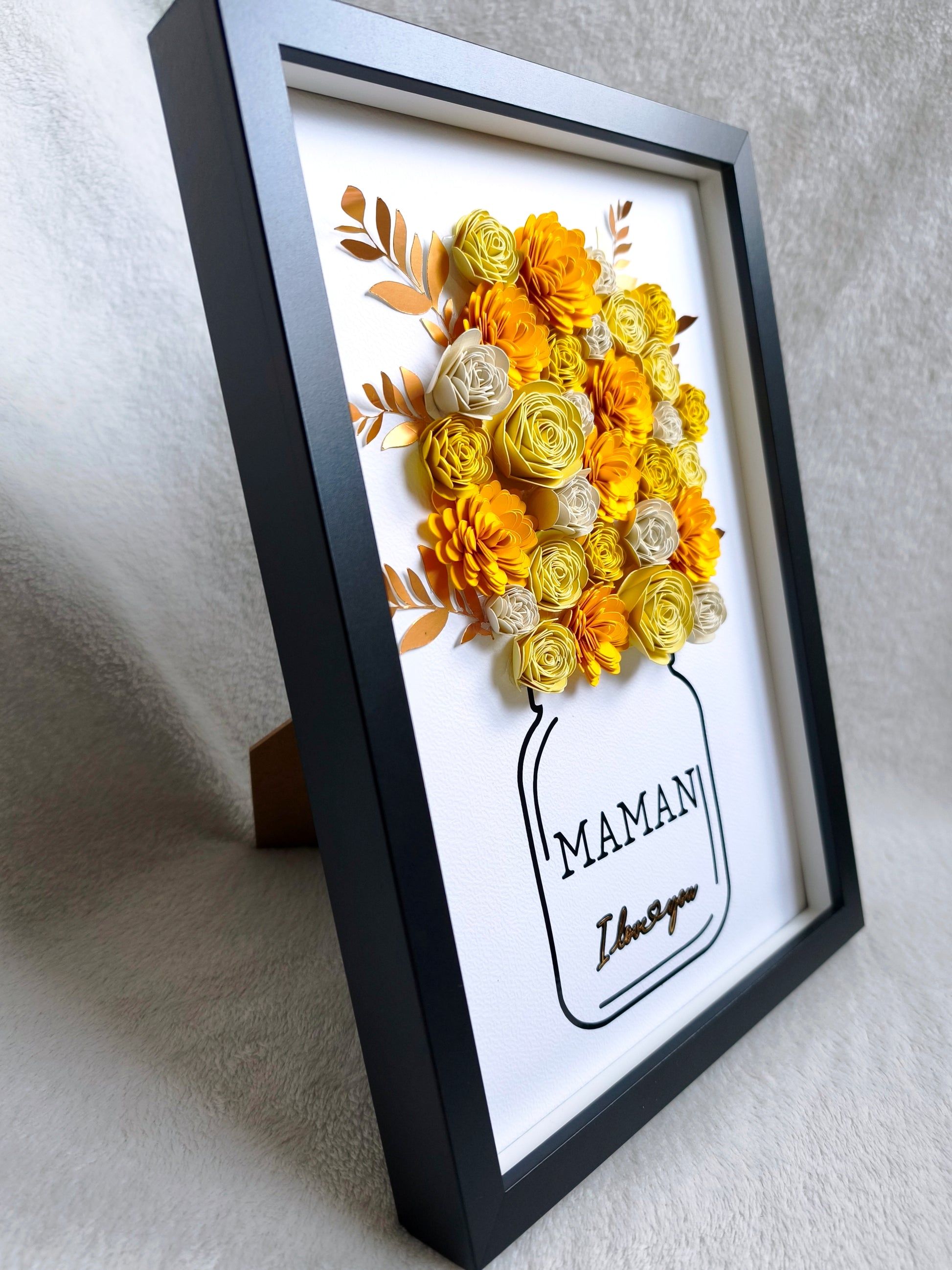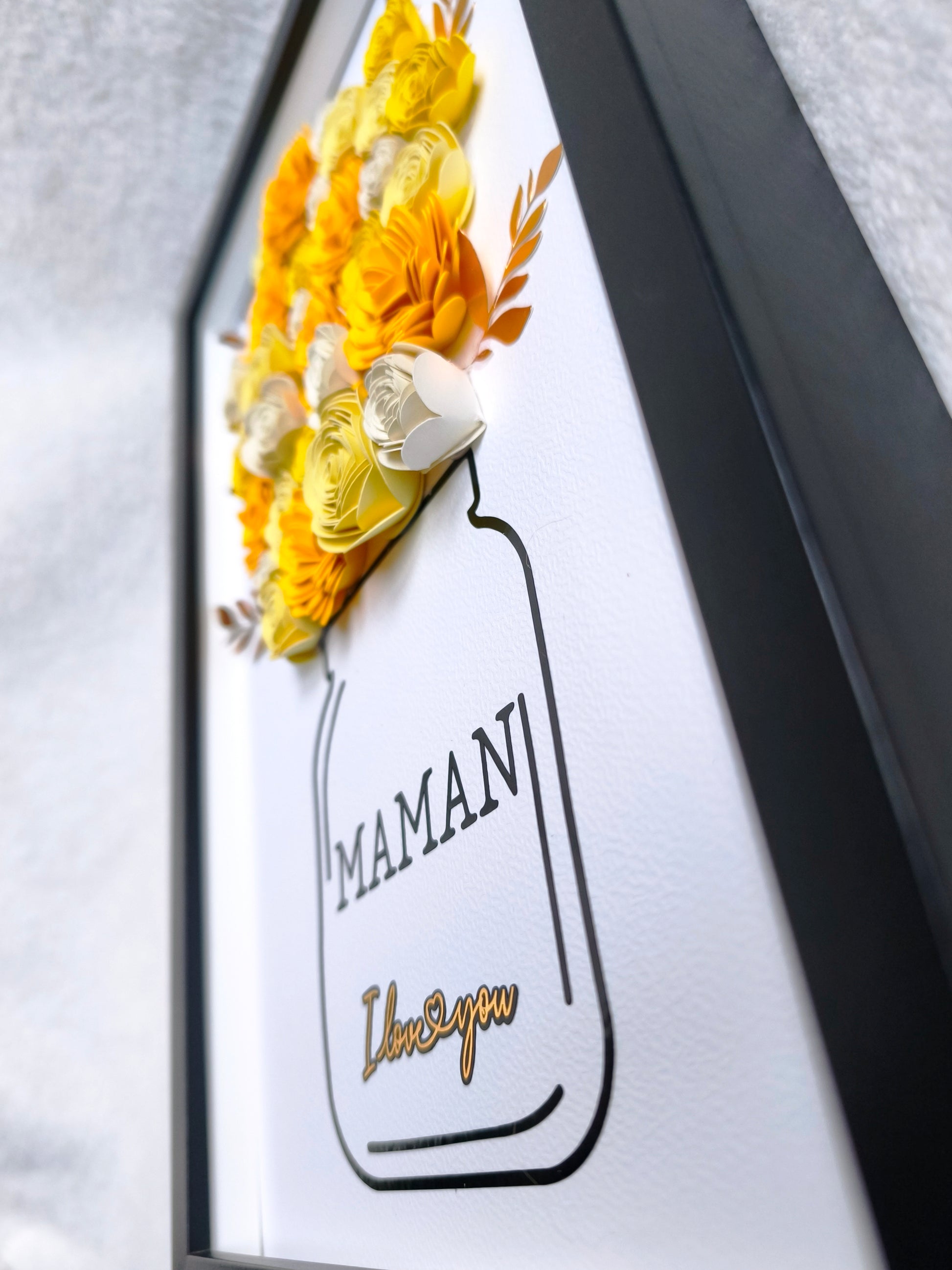 Les fleurs en papier sont travaillées en relief afin d’offrir un rendu 3D marqué, mis en valeur par un cadre volontairement sans vitre.
