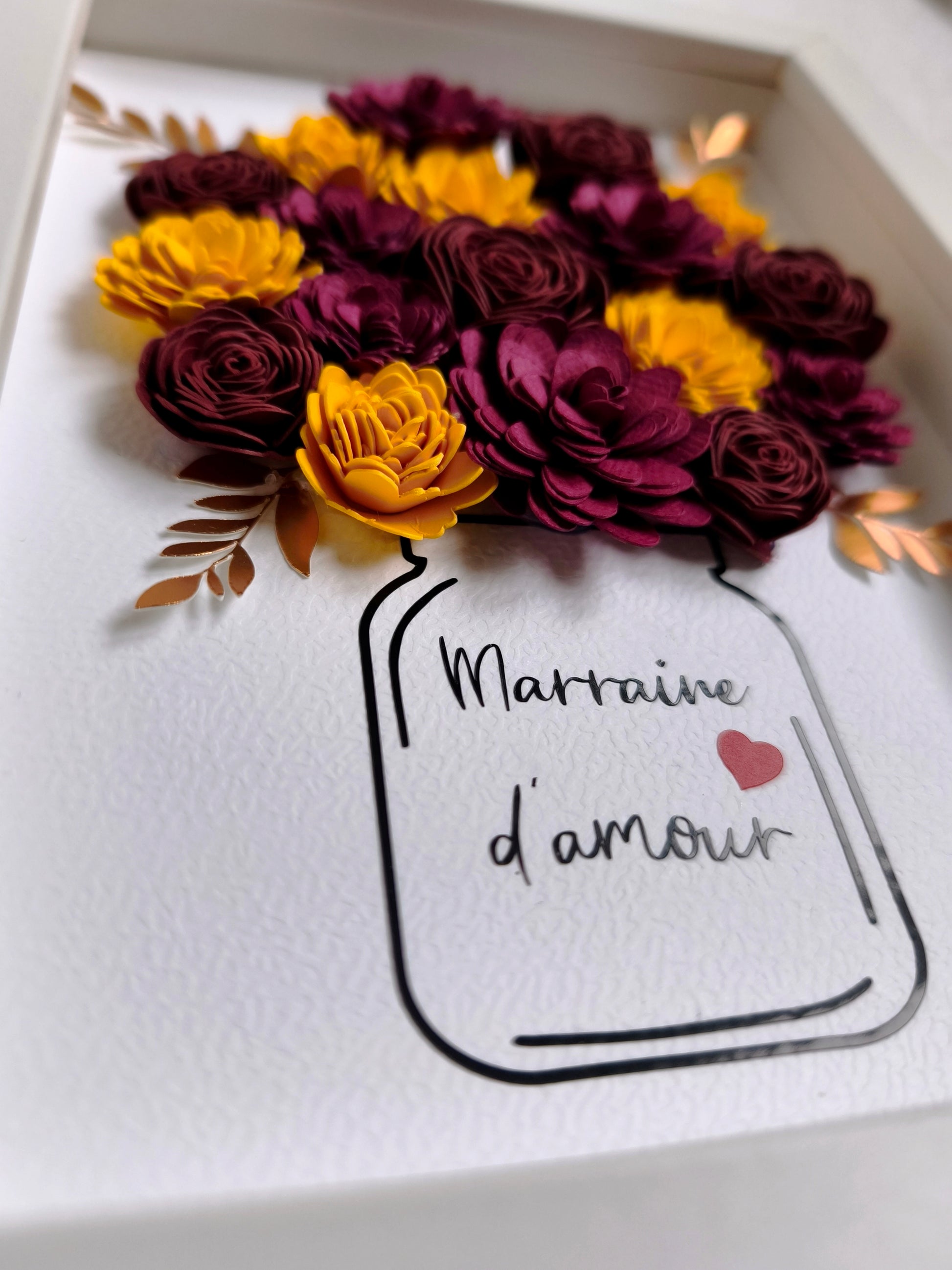 Les fleurs en papier, réalisées à la main et disposées en relief, offrent un joli effet 3D, sublimé par un cadre sans vitre.
