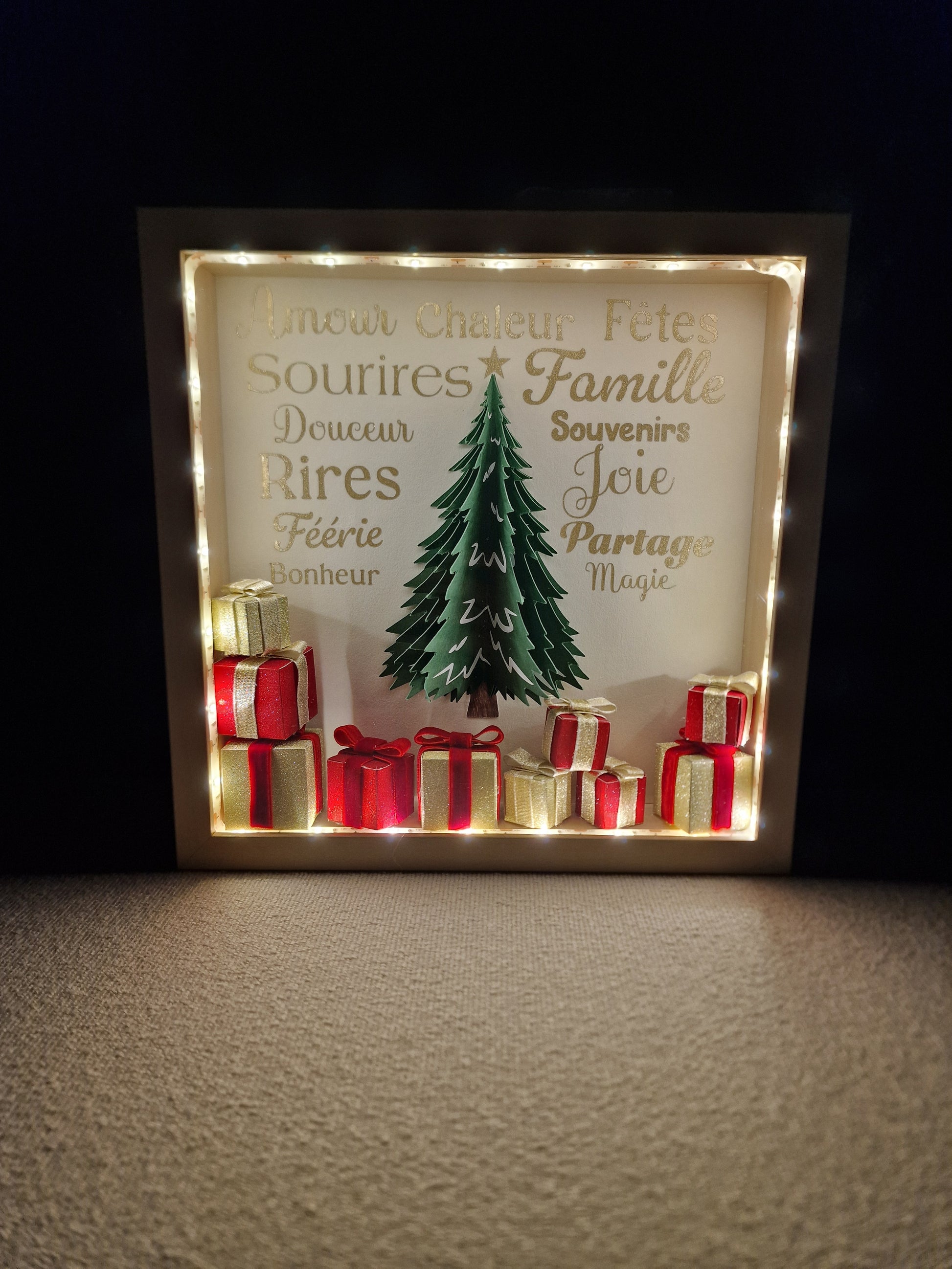 Il met en scène un sapin en relief entouré de jolis paquets cadeaux rouges et dorés, éclairé par une douce guirlande LED qui crée une ambiance chaleureuse et féerique .